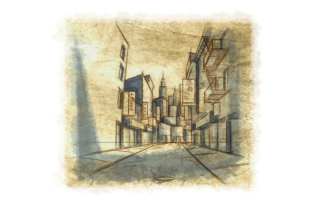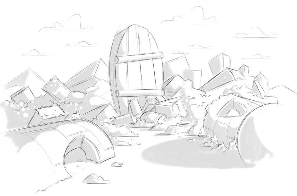A collection of environmental sketches, structural designs, and interior layout plans, setting the tone for initial world building and script specific locations and sets.
